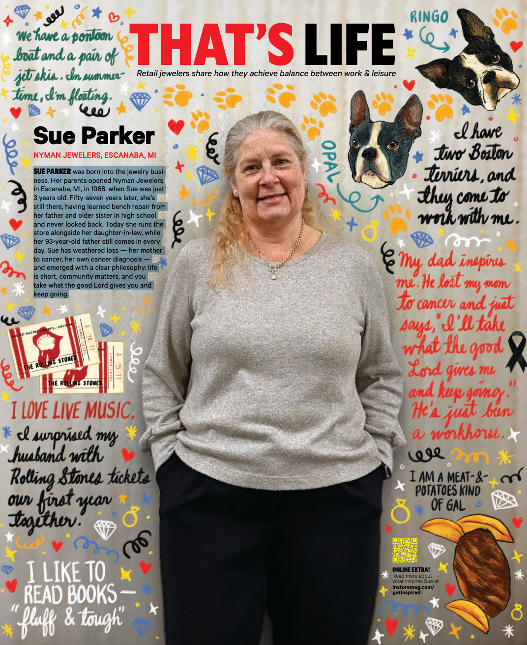 Sue Parker was born into the jewelry business. Her parents opened Nyman Jewelers in Escanaba, Michigan, in 1968, when Sue was just 3 years old. Fifty-seven years later, she’s still there, having learned bench repair from her father and older sister in high school and never looked back. Today she runs the store alongside her daughter-in-law, while her 93-year-old father still comes in every day. Sue has weathered loss — her mother to cancer, her own cancer diagnosis — and emerged with a clear philosophy: life is short, community matters, and you take what the good Lord gives you and keep going.