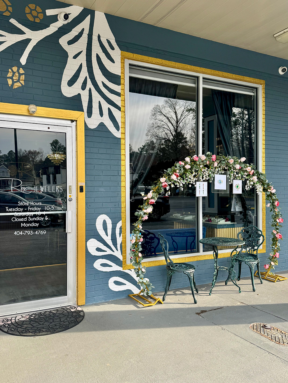 - Duvall O’Steen: Love the floral arch and bistro seating in front of the store. A very Instagrammable “scene” for clients and a nice way to extend the store’s vibes beyond the front door. The Girl Scout badge program where the girls come into the store and make jewelry with beads is lovely. Nice community support and engagement. The cross promotion with the local gym, giving a pouch for ladies to use to store their rings during workout sessions is lovely, and the message “crush your workout, not your ring.” Nice!