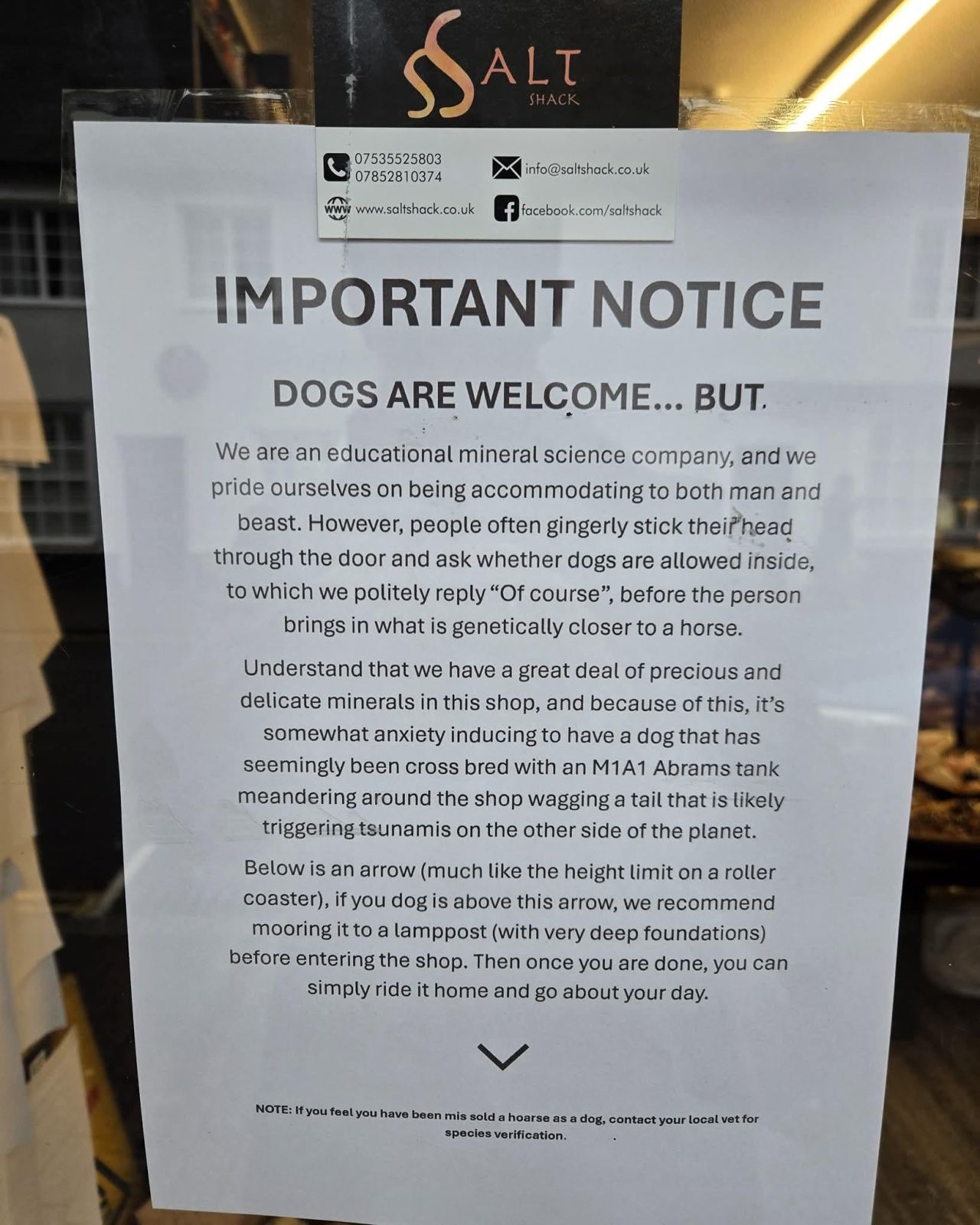 Every shop has a dog policy. But no other shop has this dog policy. Updated fire safety protocols for 2026. If your Father’s Day marquee doesn’t make someone pull over to take a photo, try harder The friendliest possible way to say “the price is the price.” No corporate jargon. No awkward eye contact. Just a laminated sign handling the conversation so the staff doesn’t have to. We absolutely love this A-frame sign. Somewhere a marketing consultant charged $15,000 for advice this sandwich board already knows. Not the funniest sign in the world, granted. But cute and very, very sweet. You could do worse than having one of these hanging outside your store. Every sign has a backstory. This one’s is probably worse than most. Imagine this sign in your store, maybe a little smaller and understated and with a more tasteful font. Think of it as a small inside joke near the front edge of your most popular cabinets — “Please do not tap on glass. It scares the jewelry.” (Extra benefit: it helps keep people from leaving too many fingerprints on your display-case glass.) California ice-cream dealer CVT Soft Serve got so tired of influencers asking for “deals”; instead, he decided to charge them double and even made a sign announcing the new policy. SOURCE: INSTAGRAM The “shop local” movement is one all jewelers should support — wholeheartedly. A sidewalk sign like this would be a lighthearted way to remind members of your community of the importance of using their dollars to support area businesses. Okay, you won’t see this sign on the front of any of Tiffany’s or Hamilton Jewelers or Hyde Park or any of INSTORE’s America’s Coolest Jewelry Stores for 2025. But, for a small-town jeweler with a quirky sense of humor, this is a solidly humorous sign. Get it redesigned by a skilled designer with some tasteful fonts and you’re providing passing patrons with a nice chuckle. We’re absolute suckers for a funny chalkboard sidewalk sign. And this one has a balance of humor and friendly vibes that we couldn’t resist. Okay, obviously this sign is for a supermarket produce section. But what we love is the idea of using printed memes to add humor to the shopping experience. Not for every store, or even most stores, but if you’ve got a sense of humor (and good taste in memes), this could make shopping in your store a more fun experience. Got a public urination problem in the area around your store? This is the sign for you. This clothing store’s ransom-note style sales pitch wouldn’t be the worst idea for a jewelry store’s Main Street-facing front window. Here’s a classic “Open” and “Closed” sign combination — with an awesome twist. Another “Closed” sign guaranteed to make customers want to come back. Here’s a “Big Sale” sign for people who despise hyped-up “Big Sale” signs. You can’t beat the honesty on display here. An impactful way to immediately establish the correct toilet paper rules in your business’s bathroom. Here’s a friendly way to remind customers to take it easy on your valued staff. Got people littering outside your business? Slap up this hilariously passive-aggressive sign and watch the trash disappear. A tasty gag for any business with an in-store bar. Oh man, we would love to work at this business. Maybe we wouldn’t love to be a customer here. But work there? Sign us up. With fall on its way, try putting your own spin on this auto repair firm’s gag about autumn’s most ubiquitous food seasoning/flavor. Video surveillance signs are about the least friendly thing imaginable. Except this one. This Domino’s Pizza franchisee certainly knows how to get people’s attention. Behold, what simply must be the best smoking-area sign ever. Nobody wants a sea of butts on the ground around their ornamental fish pond. This retailer’s sign makes the point without nagging. And another rabbit-themed version. This bathroom sign is so dark, and yet so funny. Truly selfie-worthy. Don’t you think all stripmall signs should have such personality? Or any kind of personality at all. We’ll miss you, “The Sign!” Who says you can’t hard-sell on Mother’s Day? You can’t twist arms any more effectively than this. This warning against letting children run wild in your business probably rings familiar. (But still should get a smile.) And here’s a far fresher (and funnier) spin on the “unattended children” warning. And one more. A perfect sidewalk sign … replace “Nice drinks” with “Gorgeous jewelry”. And here’s another sidewalk sign variation that could stop passersby in their tracks. Hate when people talk on the phone while at your register? Try a variation of this sign. Here’s the perfect Lionel Richie meme to place next to your current hot seller. For some jewelers, sweaty cash is right up there with “wrist cheese” as an occupational hazard. 1 | 40 Previous Imperial Pearl’s 2026 New Designs Launching Now! Up Next 16 Images That Show Why Rox Jewelers Was Named One of America’s Coolest Jewelry Stores Photo Gallery This Crystal Shop’s Dog Policy Is a Work of Art — Plus 39 More Pretty Funny Retail Signs Every shop has a dog policy. But no other shop has this dog policy. Advertisement