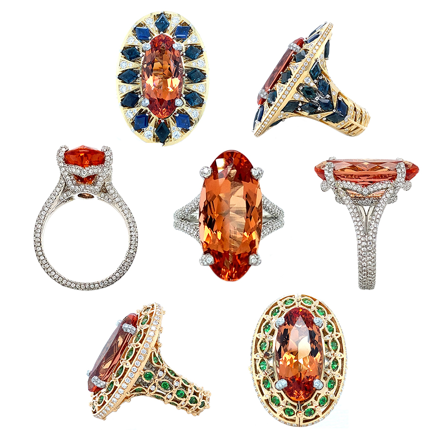 Inside, Outside, Upside Down ring set is made in 18K white, rose and yellow gold with two hinged, snap-in interchangeable jackets featuring tsavorite garnets (1.36 TCW) and diamonds (0.61 TCW) and diamond-cut blue sapphires (5.96 TCW) and white diamonds (1.60 TCW) designed to cradle a split-shank ring with an 11.96-carat moval-shape Imperial topaz and diamonds (2.46 TCW), $155,000