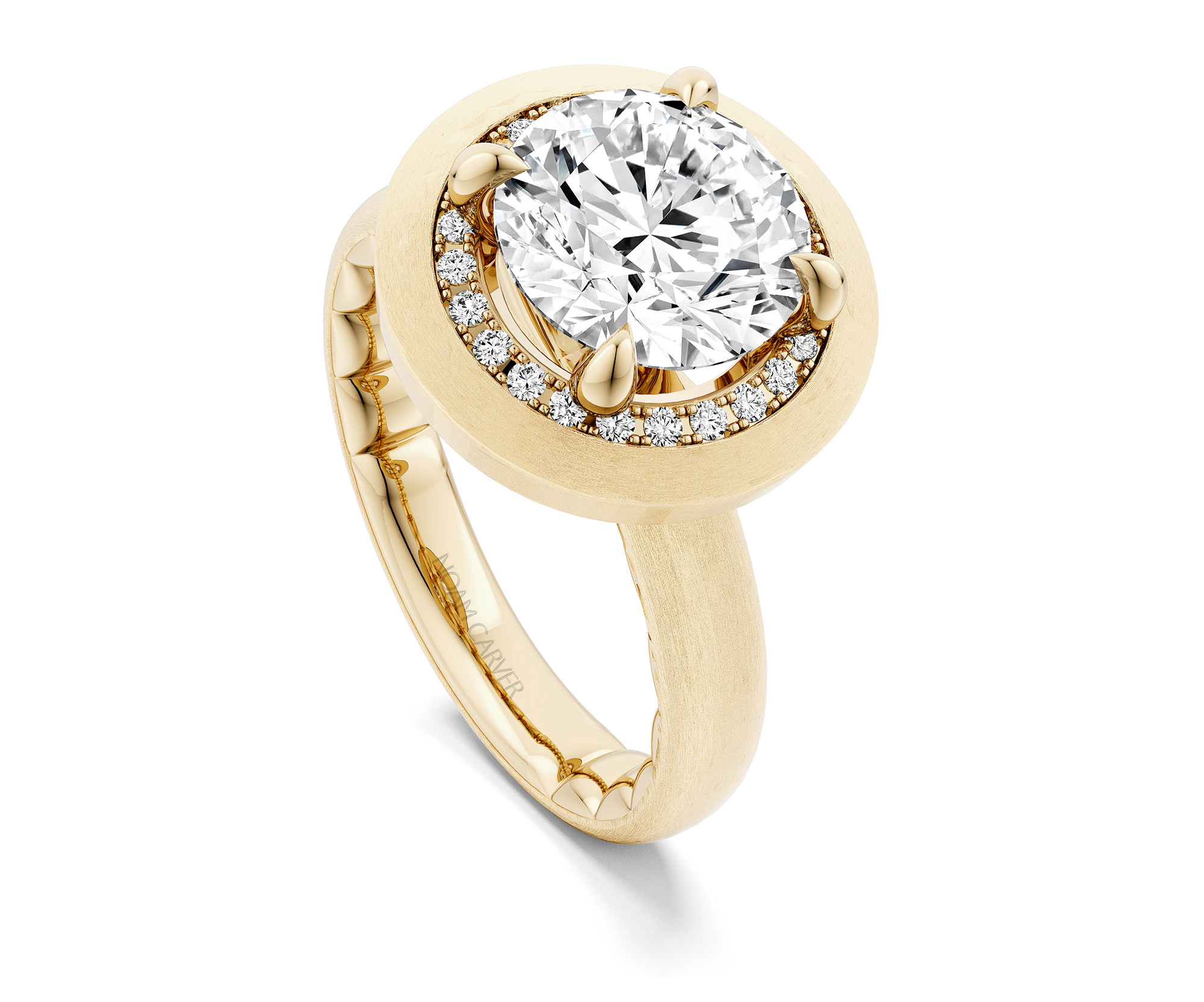 Luna Hidden Done engagement semi-mount (center stone not included) in 18K yellow frosted-effect gold features a domed bezel with an inset diamond halo (0.12 TCW), a patented pillow-comfort interior and accommodates a 2.0-carat round center, $4,300