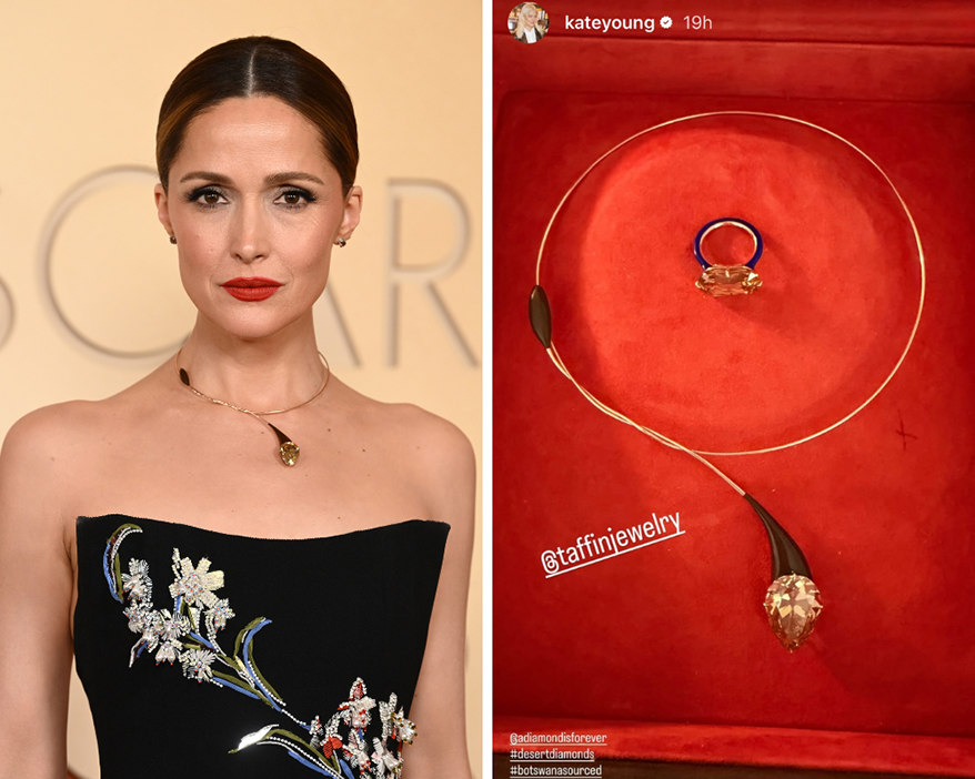 The jewels: Rose Byrne’s jewelry was by Taffin, the one-of-a-kind high jewelry line by James Taffin de Givenchy. Taffin is known for non-traditional shapes, unusual stones, and unexpected juxtapositions, all of which are evident in Byrne’s Oscars jewels.