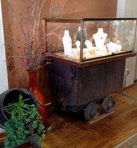 They also handcrafted the tile and marble mosaic entryway and all of the showcases. Three of those cases sit atop old mining ore cars found in Arizona mines. The counter, too, is custom made, with wood pillars, rock facets and a shingled roof. They kept the original tin ceilings. The doorknobs are custom made of clear quartz crystal balls.