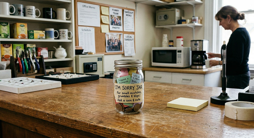 Dianna Rae High of Dianna Rae Jewelry in Lafayette, LA, keeps an “I’m Sorry” cup in the break room. Anytime someone feels they owe a small apology — a joke that landed wrong, leftovers abandoned in the fridge — they drop a few bucks in the cup. When it fills up, it’s pizza time. No HR meetings. No awkward confrontations. Just a low-key accountability system that turns minor workplace friction into lunch. Sometimes the smartest management tools cost about $3.50.