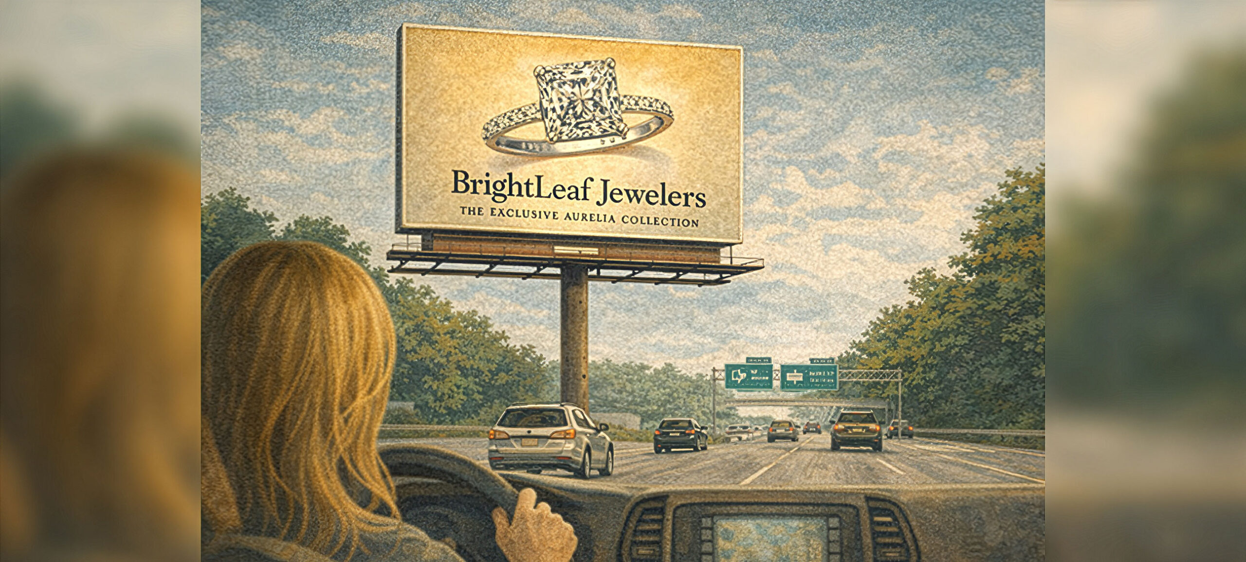 THE BILLBOARD ROSE above Route 17 like a beacon: massive, bright, and impossible to miss. On it, an eye-catching radiant-cut diamond ring shimmered beneath the lights — and beneath the ring, the name of the retailer, BrightLeaf Jewelers, was emblazoned in bold serif lettering, promising exclusivity, luxury, and authenticity. The ring was from BrightLeaf’s exclusive Aurelia collection.