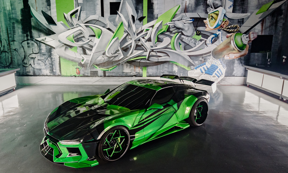 Every exterior detail of the green C6 Corvette is customized and intricately accounted for.